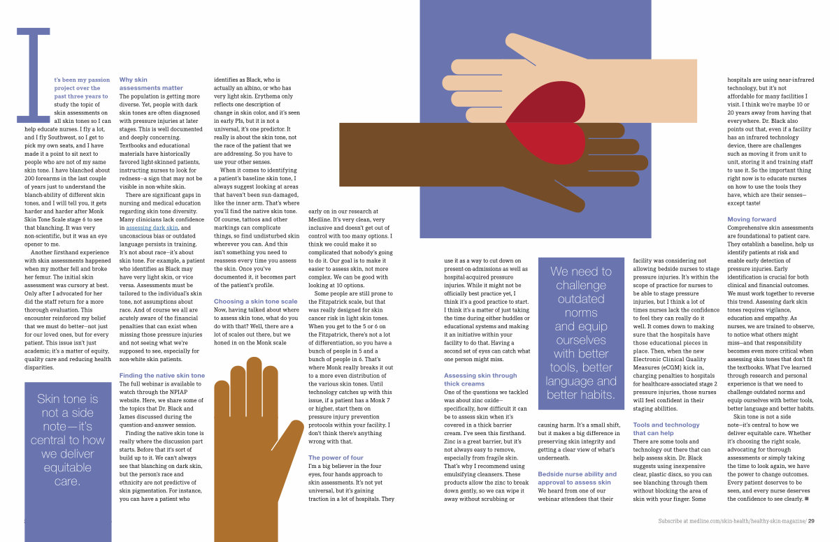 Moving forward Comprehensive skin assessments are foundational to patient care. They establish a baseline, help us identify patients at risk and enable early detection of pressure injuries. Early identification is crucial for both clinical and financial outcomes. We must work together to reverse this trend. Assessing dark skin tones requires vigilance, education and empathy. As nurses, we are trained to observe, to notice what others might miss— and that responsibility becomes even more critical when assessing skin tones that don’ t fit the textbooks. What I’ ve learned through research and personal experience is that we need to challenge outdated norms and equip ourselves with better tools, better language and better habits.