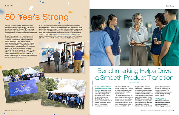One of the respiratory care facilities recently marked an impressive milestone: 50 years in operation. This location in Arlington Heights, Illinois, is Medline’ s only aseptic sterile water processing facility in the United States. Here, water from Lake Michigan is processed through reverse osmosis to produce sterilized water. That water is bottled into a bubble humidifier that is manufactured onsite through a blow-fill-seal mold process, then used for a variety of respiratory care products such as airway management, oxygen therapy, medication delivery and ventilation support.